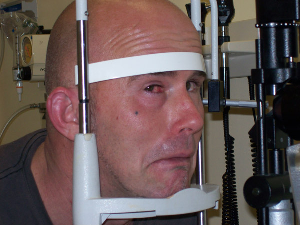 Jane had heard me arriving, and appeared in the background, "Alright Cous!" she shouted cheerily, "we had to take him to hospital today, and I've got some great pictures of him in a headbrace waiting for the Opthalmologist to examine him."